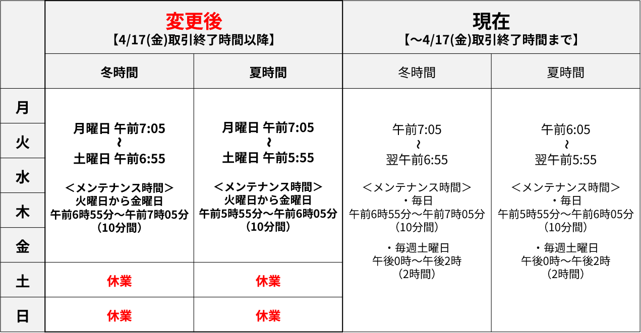 ※2026年3月30日追記:お知らせを掲載した3/27時点では、変更後の夏時間の取引時間をを6:05~と記載しておりましたが、正しくは上記のとおりです。お詫びして訂正いたします。