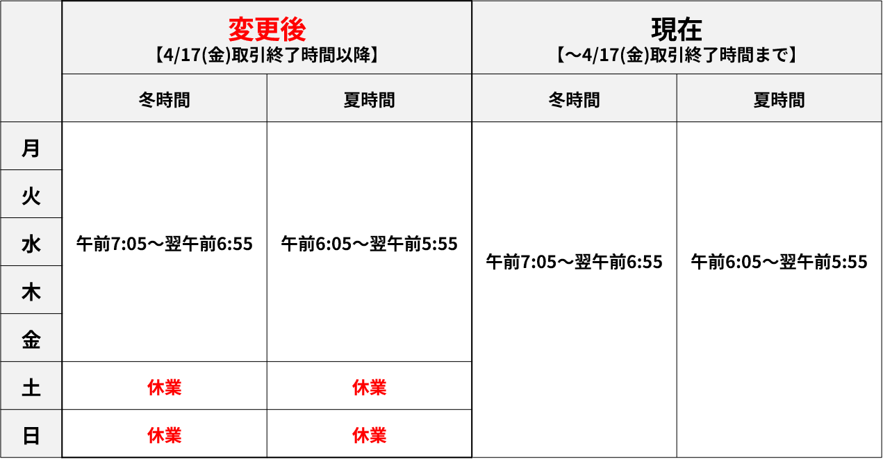 ※4月17日(金)の取引終了時間は4月18日(土)午前5時55分、翌営業日の取引開始時間は4月20日(月)午前6時05分です。